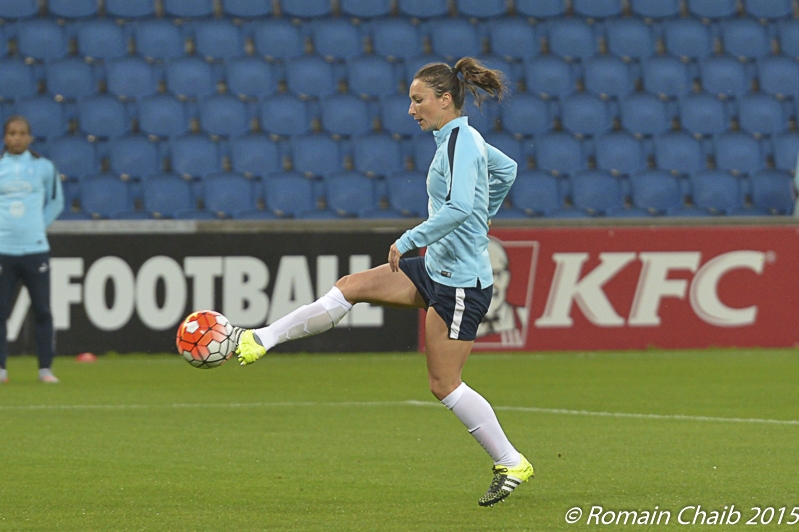 Pour ce premier match de phase de qualification pour le championnat d’Europe de 2017, Philippe Bergeroo a dû composer avec une nouvelle blessure, celle d’Elodie Thomis, survenue samedi lors de la réception du Brésil, en plus de celles de Laure Boulleau et deLaura Georges. Il aligne donc Griedge M’bock  au poste de latérale gauche, et Amel Majri est repositionnée milieu droit.